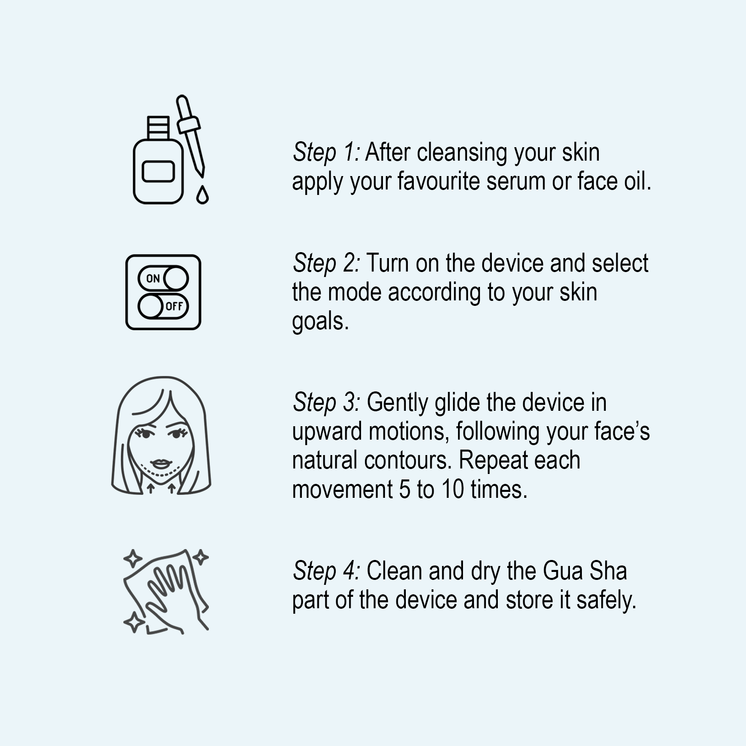 Use GLOUPSkin™ daily or at least 3–4 times a week for a couple of minutes on clean, moisturised skin by following steps 1-4. Gently glide the device in upward motions, following your face’s natural contours. Best used with your favourite serum or facial oil.